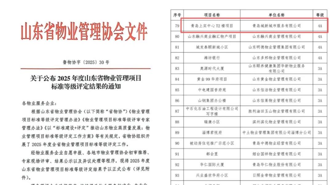 青島城投城新公司榮獲山東省物業(yè)管理4A等級(jí)認(rèn)證